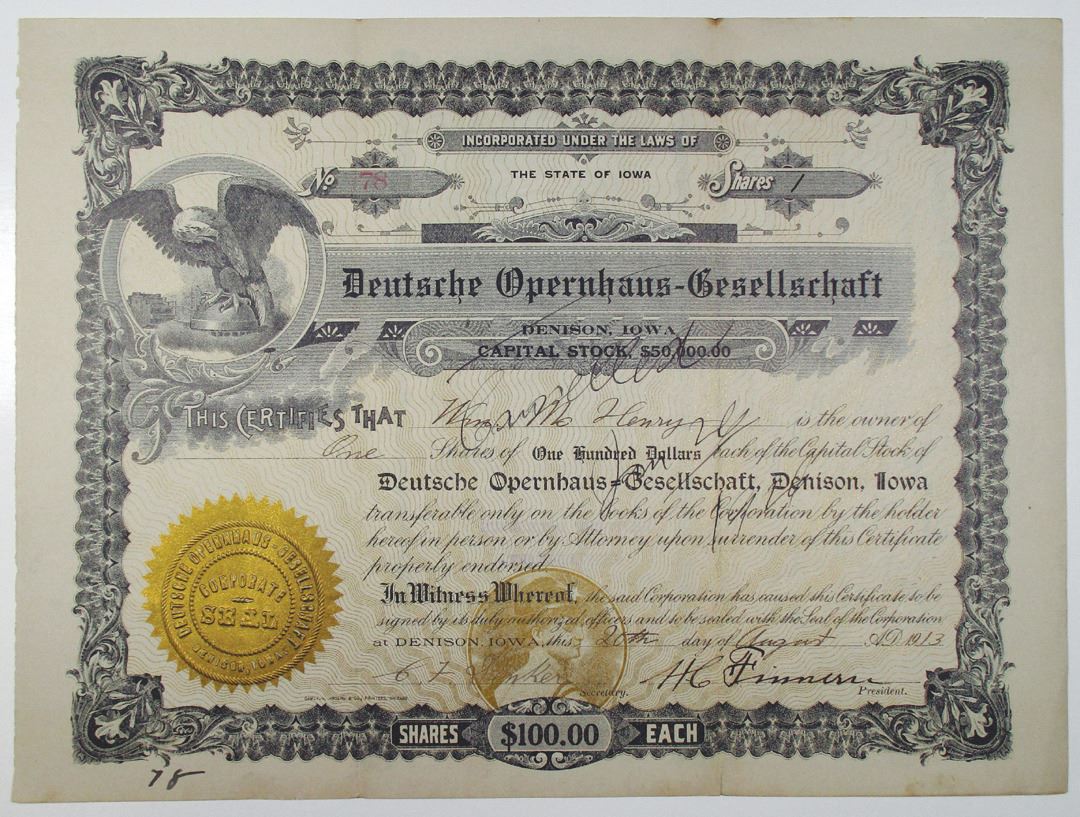 Germany & Iowa, 1913. 1 Share I/C Capital Stock Certificate, S/N 78. Black text with black border, Eagle at top left corner. Cancelled in black ink. Fine condition. Translates to German Opera House Society