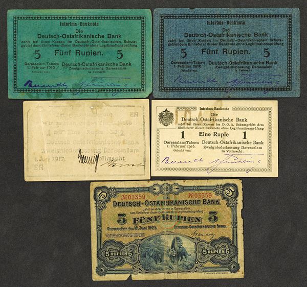German East Africa. 1, 5 Rupien. P-1. 2 lions at bottom center. Fine, paper loss; 19; 22c; 36b soft blue cardstock; e green paper. Mostly Very Fine except where noted. 5 pieces.