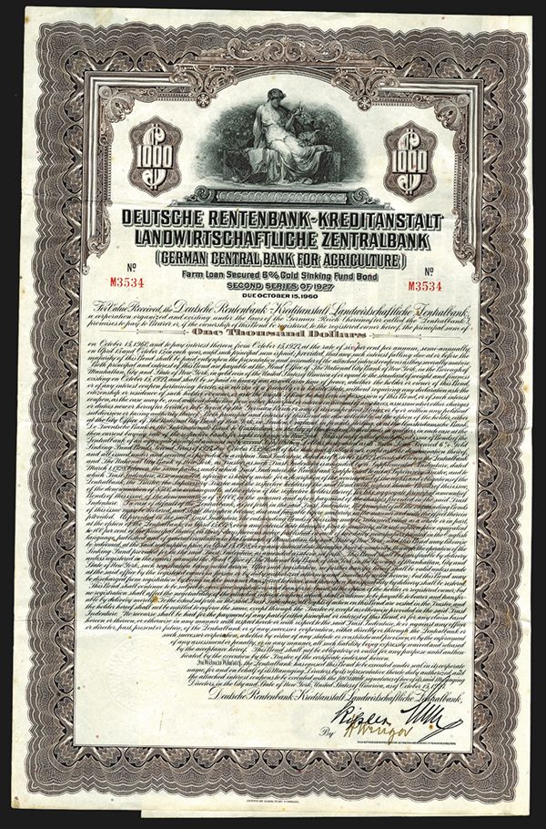 Deutsche Rentenbank-Kreditanstalt Landwirtschaftliche Zentralbank, 2nd Series, 6% Gold Loan of 1927. Germany, 1927, German Central Bank for Agriculture, $1000 Farm Loan, Issued and Uncancelled, Black on brown border with Allegorical woman, Coupons attached, VF, ABNC.