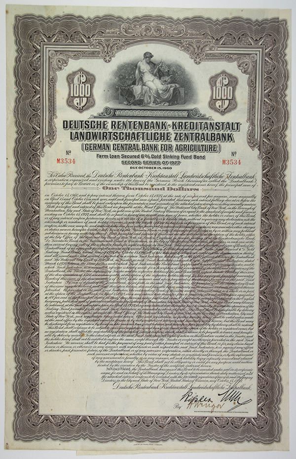 Germany, 1927, German Central Bank for Agriculture, $1000 Farm Loan, I/U $1000 2nd Series, 6% Gold Loan of 1927, Black on brown border with Allegorical woman, S/N 3534, Coupons attached, VF, ABNC.