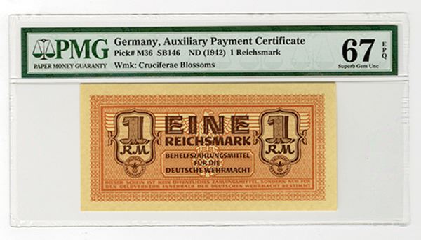 Germany. Issued 1 Reichsmark, ND (1942), P-M36, SB146. PMG graded Superb Gem Unc 67 EPQ. One of the finest known examples of this note.