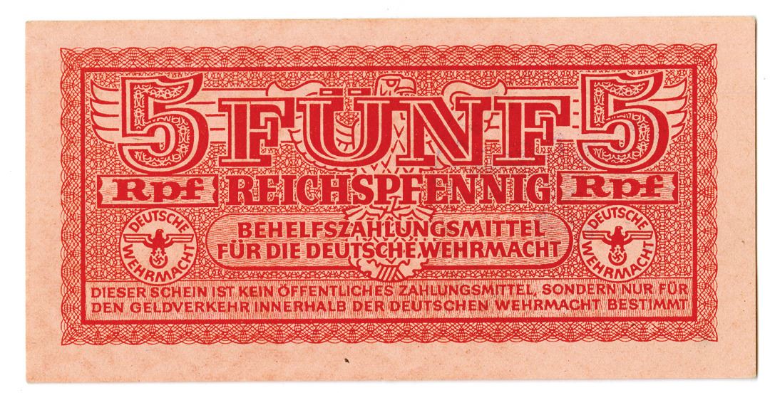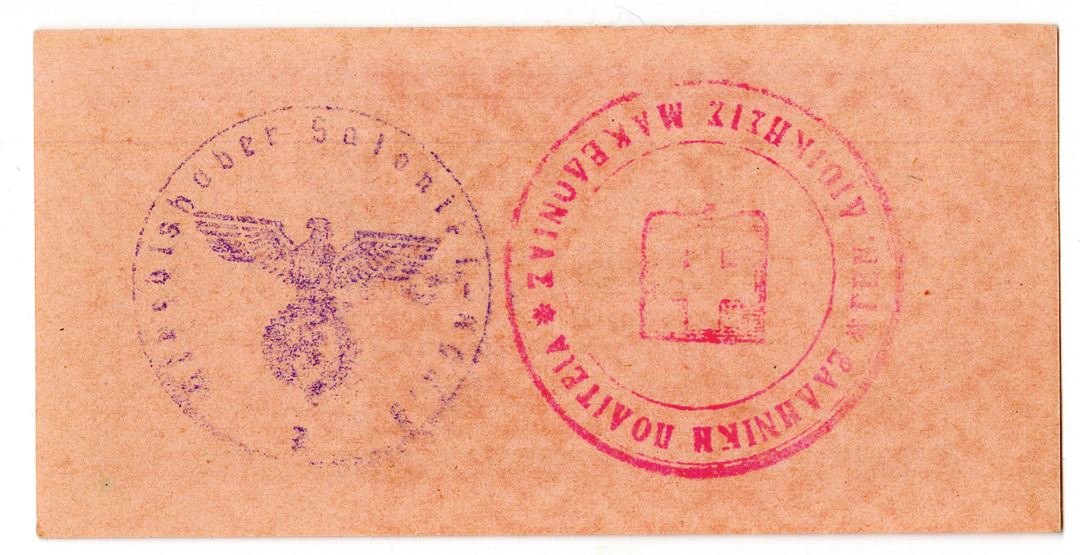 Greece and Germany.... ND (1942). 5 Reichspfennig, P-M33, issued banknote, two handstamps, one with swastika and eagle, the other with a cross in the center, uniface otherwise, Uncirculated to Choice Uncirculated or better. Nice