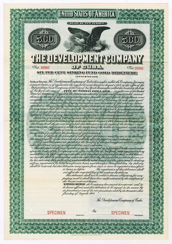 Cuba. (Incorporated in New Jersey). $500 Specimen 6% Sinking Fund Gold Debenture Coupon Bond, Black print on green border and undertint, bald eagle with a shield above company title at top, Specimen overprints and POC's, VF-XF condition, ABNC.
