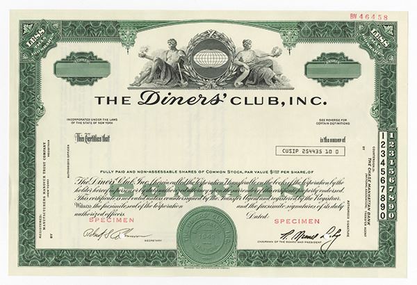 New York. <100 Shares Common Stock Specimen Certificate. Black print with a green border and under print. Vignette of two reclined allegorical men flanking company logo at top center. Red SPECIMEN overprints, POC's, VF-XF condition, SCBNC.