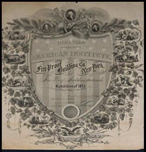 New York, 1875, Diploma awarded by the American Institute to the Fire-Proof Building Co. of New York for Fire Proof Building Materials Exhibition of 1875, Various American Bank Note Co. vignettes along the borders, Fine condition with small pieces missing along border and splitting in middle horizontal margin that could be repaired, toning, ABNC.