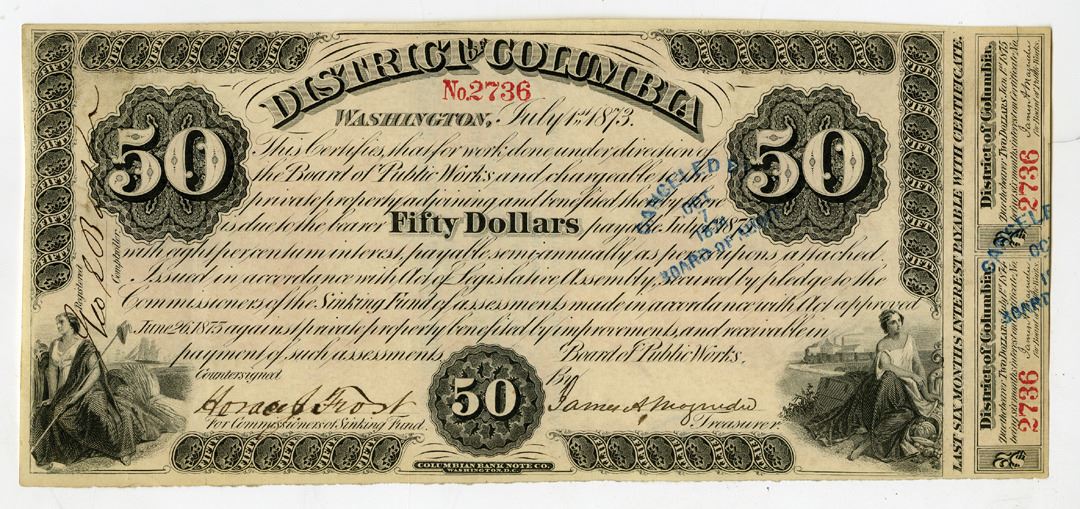 Washington, D.C., July 1, 1873. $50, I/C Obsolete Circulating Bearer Bond, Black printing with seated allegorical women on the lower left and right corners, red S/N 2736 at top middle under curved title, $2 coupon pair are uncut and attached on right border, blue cancel overprint, back orange-yellow with vertical overprint "Sewerage Certificate, Approved June 26, 1873 as follows.....construction of sewers and drains therin....", Signed by Horace J. Frost, for Commissioners of Sinking Fund. AU to Uncirculated condition. The Panic of 1873 was a financial crisis that triggered an economic depression in Europe and North America that lasted from 1873 to 1877. The Panic of 1873 and the subsequent depression had several underlying causes for which economic historians debate the relative importance. American inflation, rampant speculative investments (overwhelmingly in railroads), the demonetization of silver in Germany and the United States in 1873 and other major social issues due to wars and migration as well as the major cost due to the 1871 Great Chicago Fire and 1872, Great Boston Fire. Other factors that effected the 1873 Financial Crisis included Jay Cooke & Company's bankruptcy in September 1873. Due to the scarcity of cash and funding due to the financial panic, circulating bonds and scrip of this type were issued to facilitate business and commerce, since the recipients would know that the bond was guaranteed at a high interest rate and would be paid at a later date, with interest only being paid every 6 months to the holder. Printed by Columbian Bank Note Company. Rare and attractive circulating bond similar to Bono de Caja's issued by Mexican banks in the 1890s to 1910.