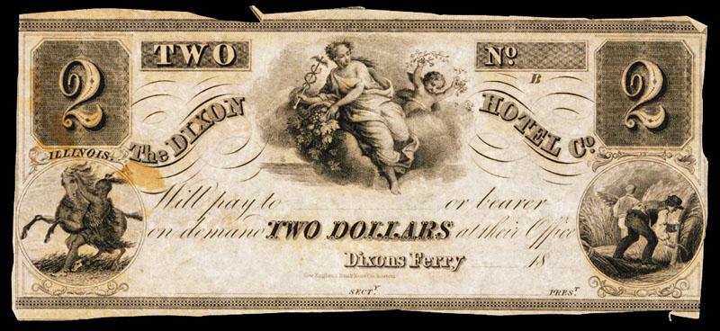 Dixon Hotel Co. Obsolete Banknote.Dixons Ferry, Illinois, 18xx, (ca.1830's), $2, Unlisted in Haxby, Unissued, Black with native American and horse on lower left, reaper lower right and allegorical woman on cloud with cherub, VF condition with small stain on left margin area, NEBNC.