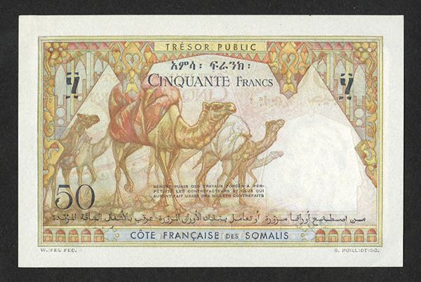 French Somaliland, 50 Francs, P-25, Issued, light brown on m/c, ship at right, back with camel caravan, S/N 933-J.18, Uncirculated to CU. Attractive note seldom seen this nice.