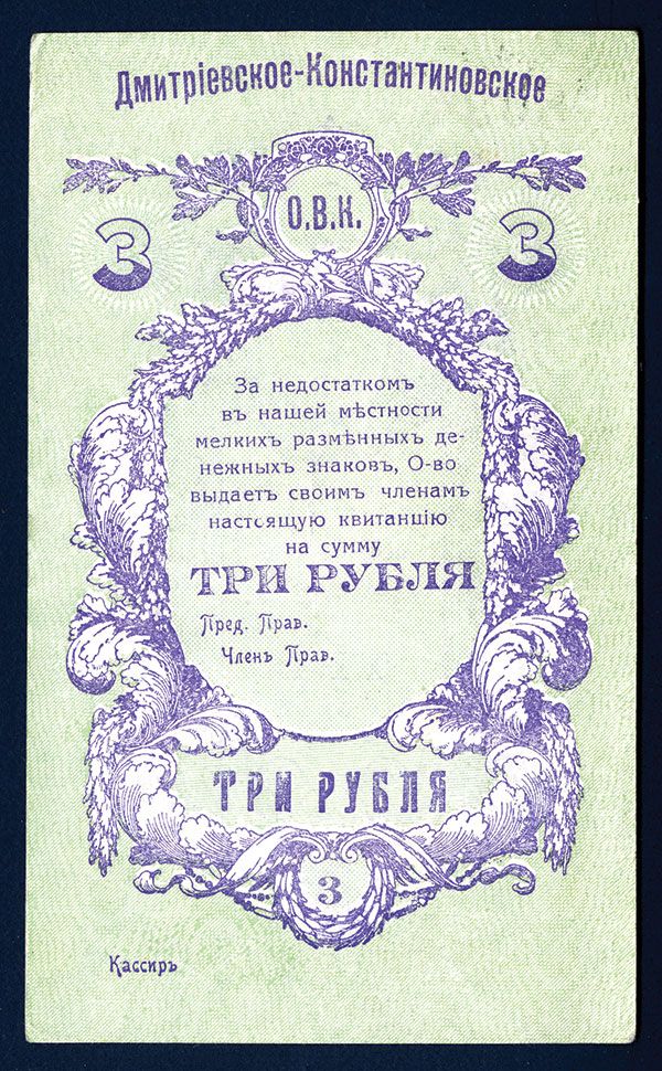 Ukraine, local issue note, 3 Roubles, 1919, choice VF. No signatures even though text on the note indicates it's only valid with signatures and handstamp of the Society, as such likely a reminder note.