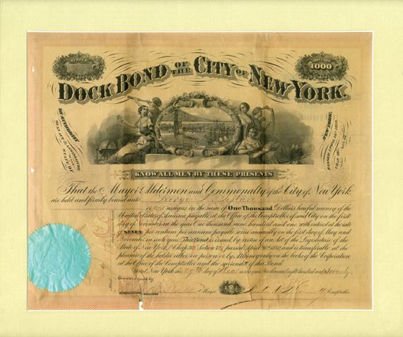 New York City...., 1870. $1000 I/C 7% Bond, Black print with red border and underprint, Allegorical women flank view of Brooklyn Bridge over Hudson River at center, Bond is made out to George K. Sistare (who was a banker that killed himself after the crash of 1890) and signed by Mayor A. Oakey Hall. Bond is in Fine to VF condition and is mounted in a glass frame that shows off the front and back of the bond.