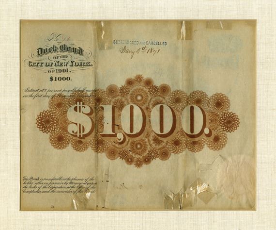 New York City...., 1870. $1000 I/C 7% Bond, Black print with red border and underprint, Allegorical women flank view of Brooklyn Bridge over Hudson River at center, Bond is made out to George K. Sistare (who was a banker that killed himself after the crash of 1890) and signed by Mayor A. Oakey Hall. Bond is in Fine to VF condition and is mounted in a glass frame that shows off the front and back of the bond.