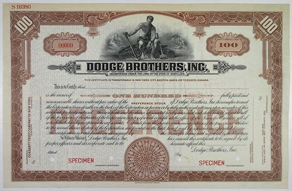Maryland, ND (ca.1920's). Specimen stock certificate. 100 Shares. Preferred, Brown border. POC's. Choice uncirculated. ABNC. Scarce certificate. In 1902 the Dodge Brothers were approached by Henry Ford and helped him with financing and manufacturing parts for his automobile up until 1913. In 1914 they went on their own to form their own automobile company. In 1925 the company was sold to Dillon, Read & Company for $148 million, said to be the largest financial transaction to take place up till that time. In 1928 Dodge Brothers merged with Chrysler. Rare and historic automobile company.
