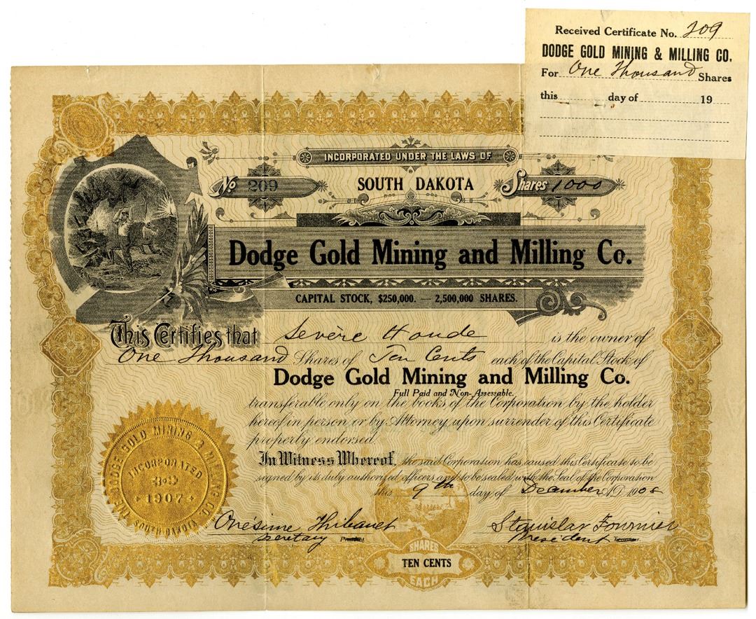 South Dakota, 1908. 1000 Shares I/U Capital Stock Certificate, Black text with gold border and background, Men at work in mine at top left corner. VF condition.