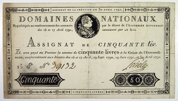 France, 1792. Issued 50 livres, P-A58, 20x11.5cm, features a bust of King Louis XVI at top center. Was issued the same year as the foundation of the French First Republic (1792) following the events of the French Revolution. In VF condition with toning on left margin.