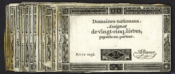 France. Domaines Nationaux Assignats. 25 Livres. 6.6.1793. Several series represented. Two blind embossed seals on each, some nice, some with stains. SCWPM A71. Generally Very Good to Fine. 21 pieces.