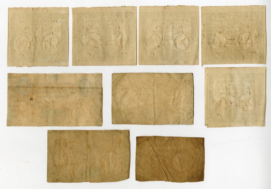 France, 1791-93. Lot of 9 Remainder French Assignats, Includes: Domaines Nationaux 25 Livres, P-A52, 1791; 15 Sols, P-A65 (5), 1792; 10 Livres, P-A66b (2), 1792; Republic of France 5 Livres, P-A76, 1793. Notes range from VG to VF condition with toning and handing. (9). Sold "AS IS" no returns accepted.