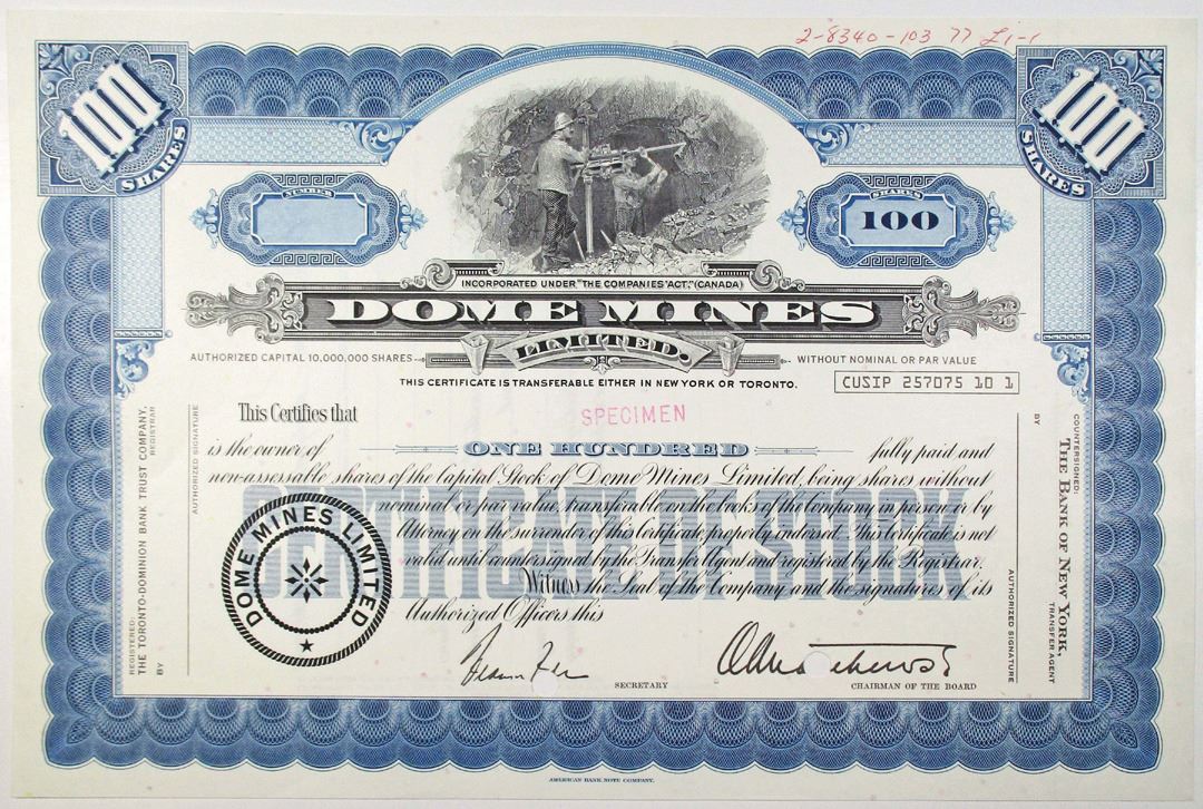 Canada, 1977. 100 Shares Specimen Stock Certificate, Black text with blue border and underprint, Men at work in mine at top center. Red specimen overprint and POCs. VF condition, ABNC.