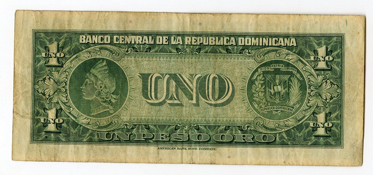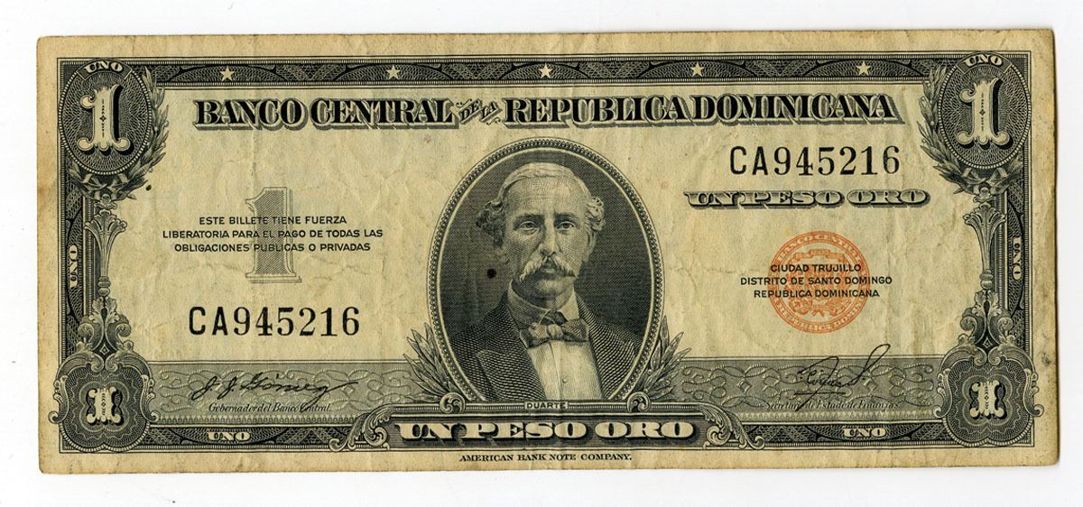Dominican Republic, ND (1947). 1 Pesos Oro, P-60b, Issued Banknote, Black with orange seal at right and portrait of Duarte at center, Fine to VF+ condition, ABNC.