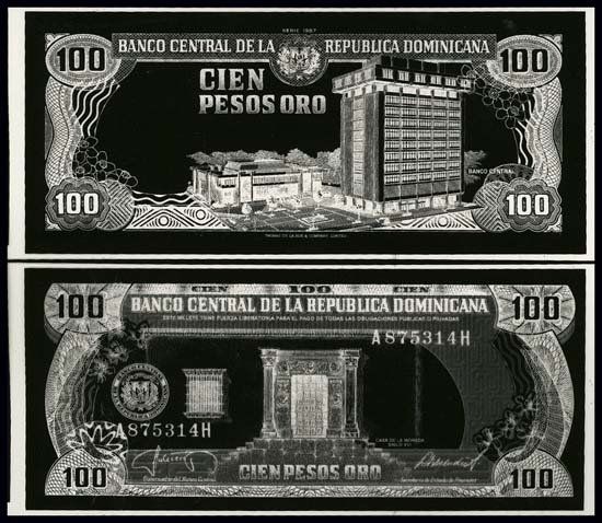 Serie 1987. P-122 Unlisted. 100 Pesos Oro. Banknote sized compound film negative of front and back of banknote printed by Thomas De La Rue used by USBNC for reference and forproduction of the early essay proofs of the 1988 Series printed by USBN. 10 x 8 inches. This negative served as an early model of the 1988 series. The metal printing plates would be coated with a photo sensitive coating and exposed to light with thepositive or negative film placed on it and then chemically etched. Unique banknote production related photo proofs. USBNC.