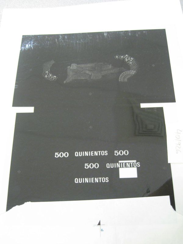 Serie 1988. P-129, 500 Pesos. Film negative of banknote back progressive undertint of 500 Pesos banknote. 8.5 x 4.75 inch size and exquisitely detailed. This film negative served as the basis for the 1988 series undertint. Also included is a denomination film negative. Also included is the undertint proof of the face and back printed on banknote paper from the plate made from this film negative. Unique banknote production related photo proof. USBNC.