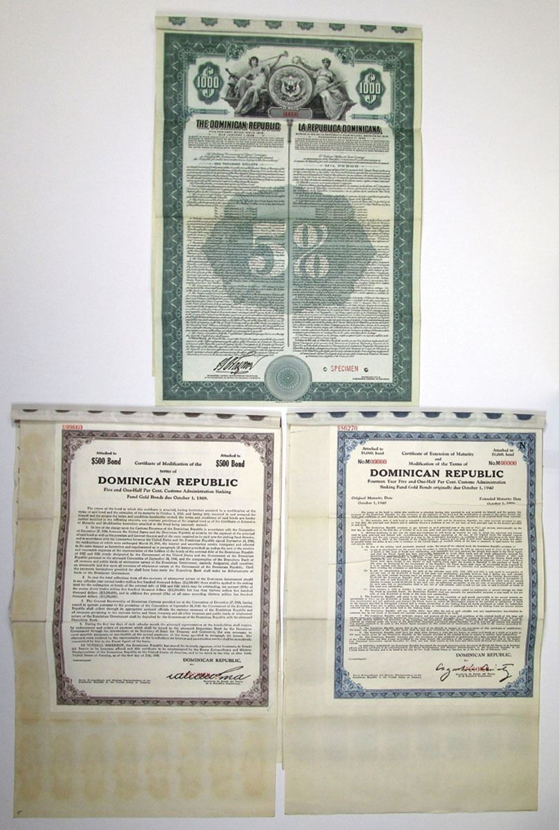 Dominican Republic, 1918 to 1914 Lot of 3 Specimen Bonds, Includes: 1918, $1000 5% Coupon Bond, Black with green border, Two figures at top flanking seal of DR; 1937 $1000 5 1/2% Customs Administration Sinking Fund Gold Coupon Bond, Black with blue border and no vignette; 1941, $500, 5 1/2% Customs Administration Sinking Fund Gold Coupon Bond, Black with brown border and no vignette. Bonds all have Specimen overprints, POCs, are in VF to XF condition with repairs made at splits, printed by ABNC. (3). Sold "AS IS" no returns accepted.