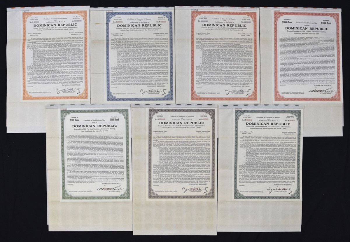 Dominican Republic, 1937-41. Lot of 7 extensions of terms. Includes: $500 (2) and $1000 (5) Certificates of Extension of Maturity and Modification of the Terms 5 1/2% Customs Administration Sinking Fund Gold Coupon Bond. Bonds are in Blue, Orange, Red/Orange (2), Brown, and Green borders with title at top. All have Specimen overprints, POCs, and are in VF-XF condition. ABNC. (7). Sold "AS IS" no returns accepted.