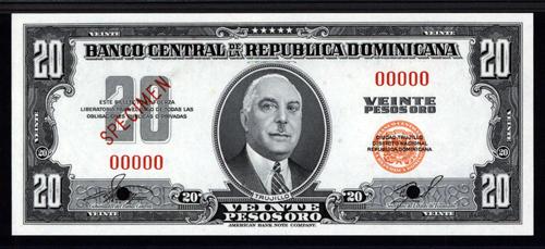 Dominican Republic. ND (ca.1956-58), 20 Pesos Oro, P-83, Specimen banknote. Black with no underprint, orange seals, red specimen overprints, "00000" serial numbers, POC's, Portrait of Trujillo in middle. PMG graded "67 Superb Gem Uncirculated - EPQ (Exceptional paper quality)", Extremely Rare note that is rarely seen in any form and very possibly only available as specimen or proof. This is the base note for the commemorative 1956 ND Issue, P-70, but it is missing overprint. Very possibly this was never issued other than as a commemorative. ABNC. Very possibly one of the finest known of this issue and it would be extremely difficult to improve upon.