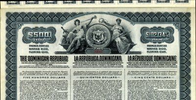1908. $500/102 Pounds. Specimen 5%, Customs Administration Sinking Fund Gold Loan. Due 1958. Slate blue border. Allegorical women flank Dominican Arms. Red specimen overprints, POC's and "00000" serial numbers. Coupons attached. Denominations are in U.S.$'s; Francs; Marks and Florins. Bond is in 3 languages, English, French and Spanish. XF condition. Rare bond. ABNC.