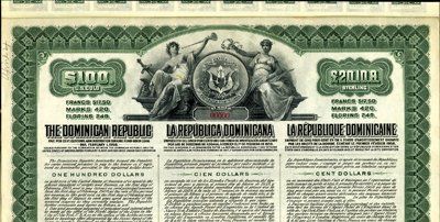 1908. $100/20 Pounds. Specimen 5%, Customs Administration Sinking Fund Gold Loan. Due 1958. Green border. Allegorical women flank Dominican Arms. Red specimen overprints, POC's and "00000" serial numbers. Coupons attached. Denominations are in U.S.$'s; Francs; Marks and Florins. Bond is in 3 languages, English, French and Spanish. XF condition. Rare bond. ABNC.