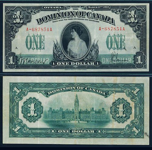 Ottawa, Canada, March 17th, 1917. $1, P-32c, (DC-23b-i), ABNC imprint with Saunders signature on right, black on green underprint, Princess Ramsey in middle, back green with Parliament building, PMG graded “30 Very Fine”, “ S/N A-687854A”, the note has exceptional firm and crisp paper quality, bright colors, large margins and sharp corners and has seen minimal circulation for grade and has claims to Choice VF. Attractive and popular issue. ABNC, Ottawa.