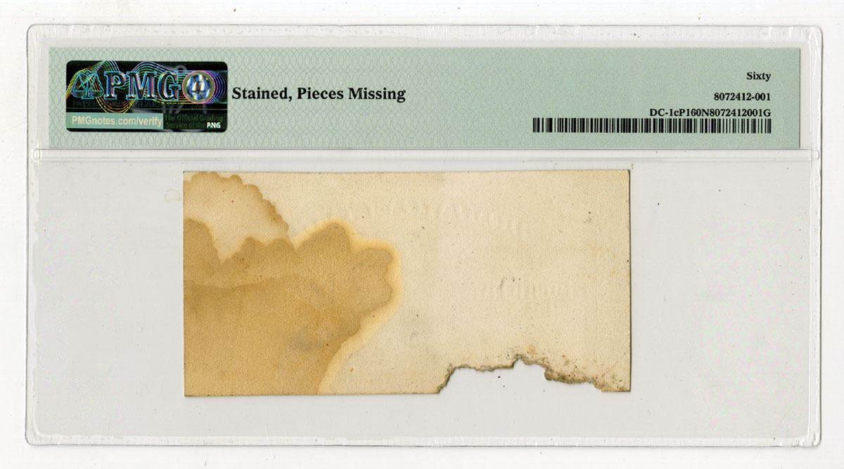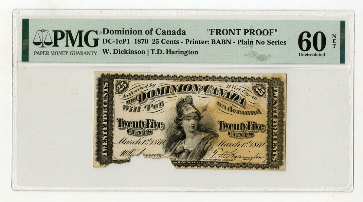 Canada, March 1st, 1870, 25 Cents, P-8ap DC-1cP1, Face proof, Black without underprint, Britania with spear at center, W. Dickinson | T.D. Harington signatures, Plain, No Series, PMG Uncirculated 60 NET with comments "Stained, Pieces Missing". BABNC. This is the only example for this variety that has been graded by PMG and very possibly unique. It originally came from the engravers files.