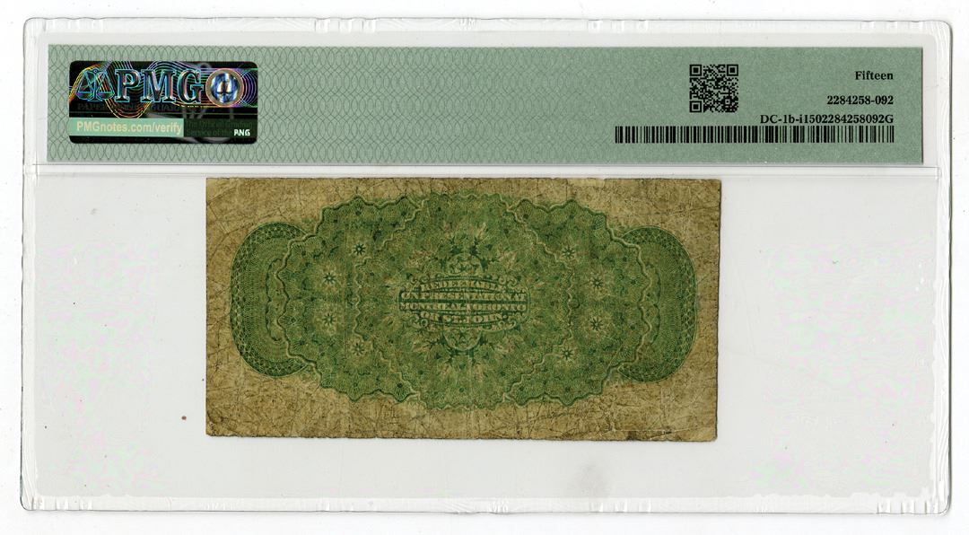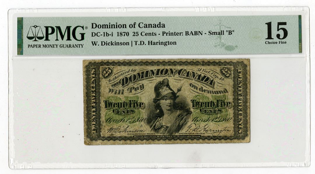 Canada, 1870. 25 Cents, P-8c, DC-1b-i, Issued Banknote, Black on green underprint, Britannia with spear at center, PMG graded Choice Fine 15, BABN.