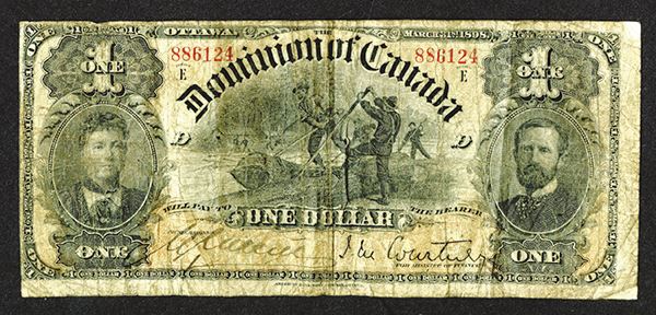 Canada. Dominion of Canada. 1 Dollar, 1898. Lumbermen preparing to float logs at top center, portraits of the Countess and Earl of Aberdeen in corners. Signature Courtney, Series E. SCWPM 24Aa. Fair to Good.