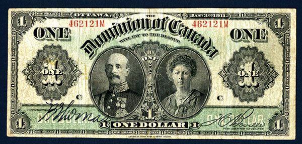Ottawa, Canada, 1911, $1, Series A, P-27b (DC-18), Issued banknote, Black on green underprint, Portrait of Earl and Countess of Grey in middle, back green with parliament building, S/N 462121M, plate letter "C" on either side of portraits, Black line over signatures, printed signature on right, hand written on left, Choice Fine to VF, very attractive note. ABNC- Ottawa.