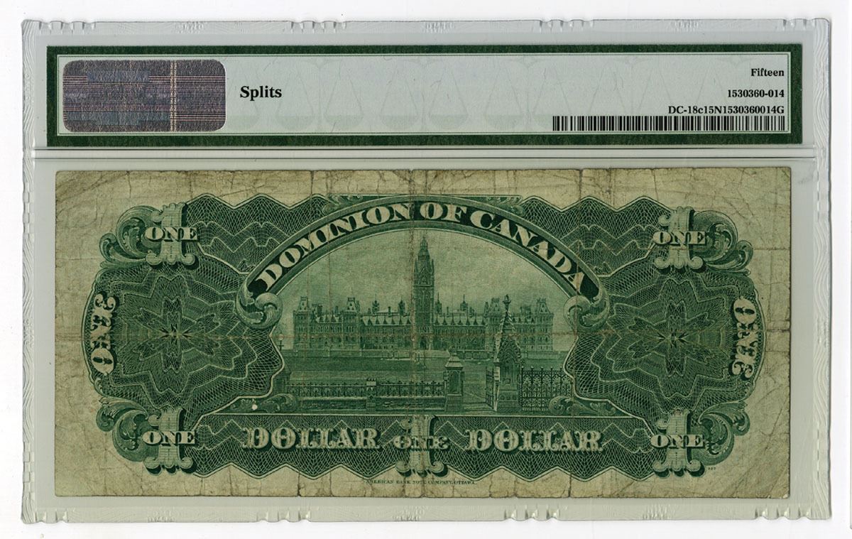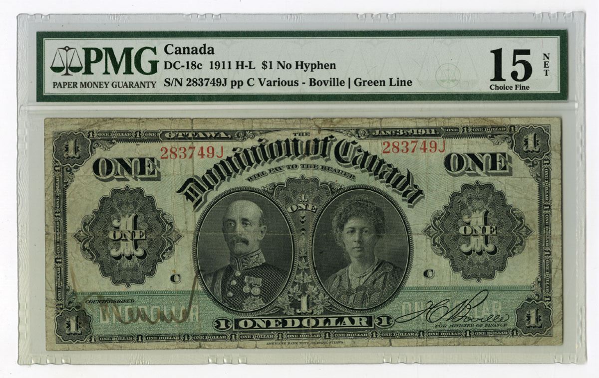 Ottawa, Canada. 1911, $1, DC-18c, H-L, No Hyphen, Black on light green underprint, S/N 283749J pp C, PMG graded Choice Fine 15, with note of minor paper splits. ABNC, Ottawa.