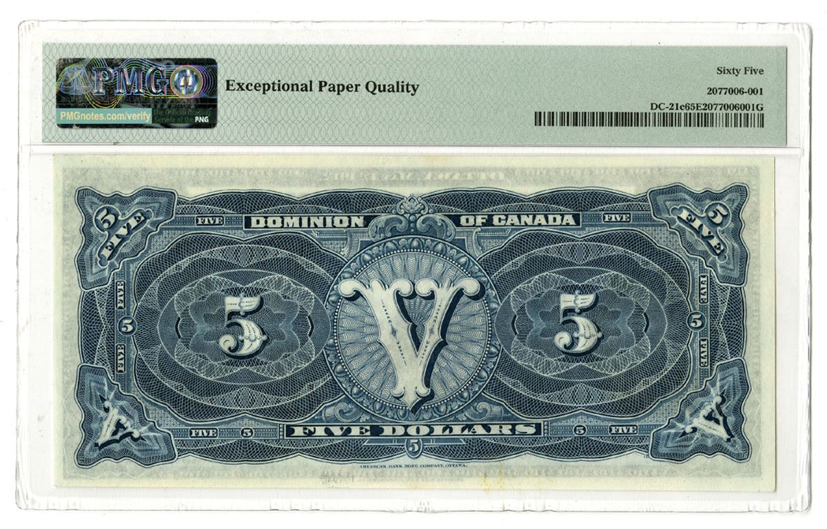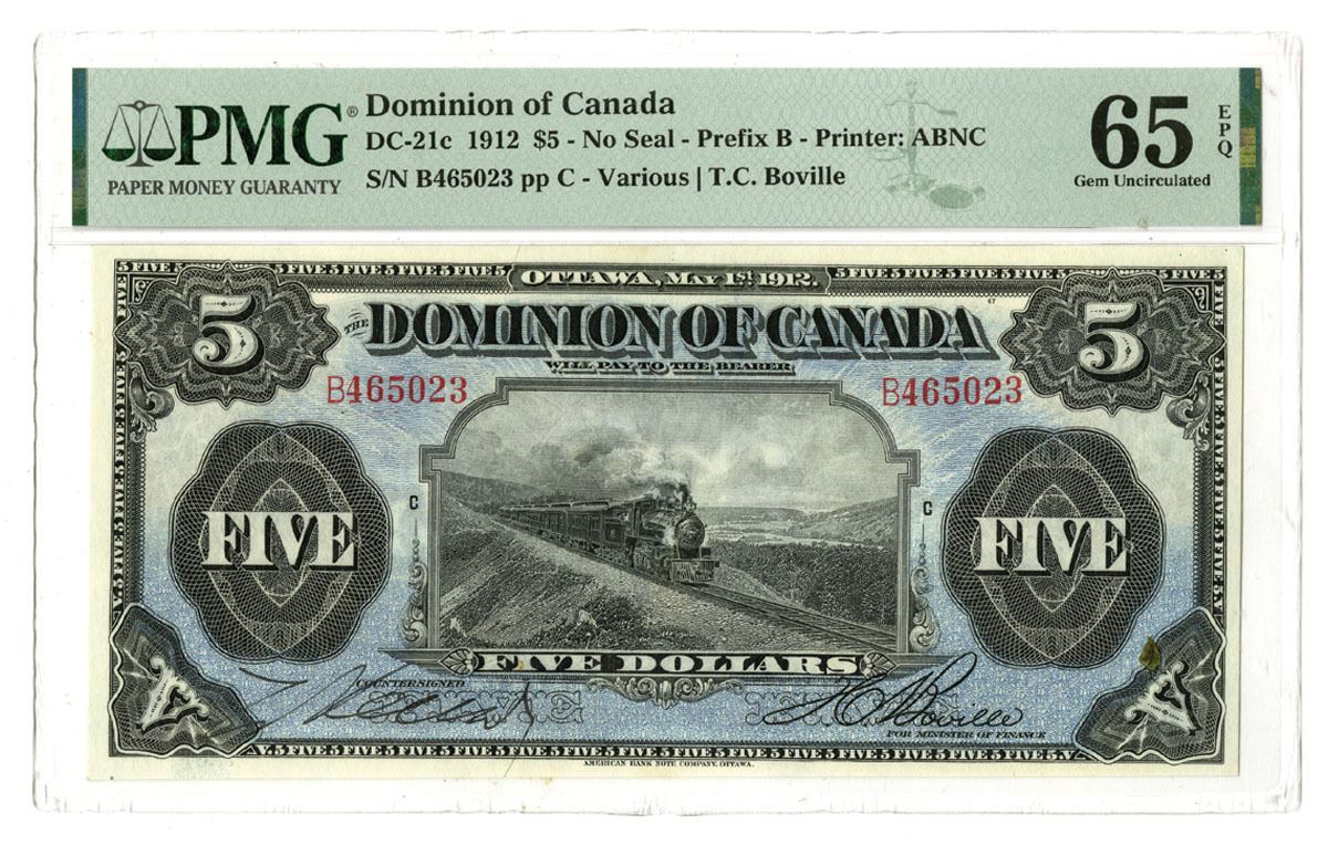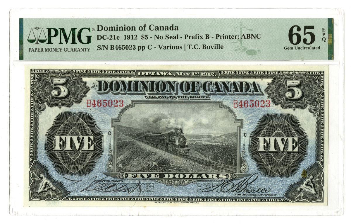 Ottawa, Canada, May 1st, 1912, $5, DC-21c, Issued banknote, No Seal, Prefix B, Black with blue undertint, locomotive L-R through countryside, Various | Boville signatures, S/N B465023, PMG graded Gem Uncirculated 65 EPQ. This 1912 $5 Dominion of Canada note is a beautiful example of early Canadian currency. The note features crisp, original paper with sharp design details and excellent margins. The front of the note depicts a highly detailed scene of a steam locomotive, symbolizing Canada's industrial development at the time, with the iconic "DOMINION OF CANADA" inscription across the top. The serial number B465023 is printed in red, contributing to its visual appeal. The reverse side of the note showcases intricate vignettes and patterns with the denomination "FIVE DOLLARS" prominently displayed. An exceptional note missing from most collections in this high grade designation.