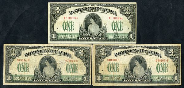 Canada, lot of 3 notes, all are 1 Dollar, 1917, P-32, Includes 2 examples of P-32a, Fine to VF and a single example of P-32c in VF to Choice VF.