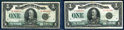 Ottawa, Canada. Lot of 2 notes, both 1923 $1, both P-33a, with King George V Portrait, Includes black seal, Hyndman and Saunders signatures, Series B-1, S/N B-449262, PMG graded VF 25 and C-1, S/N C-205599, PMG graded VF20. Canadian BNC.