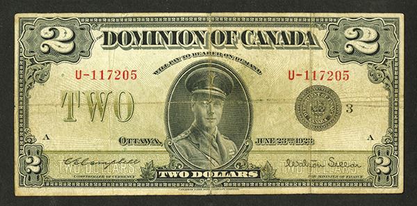 Ottawa, Canada, $2, P-34j, Issued, Campbell | Seller signatures, S/N U-117205, portrait of Edward, Prince of Wales at center, Fine to Choice Fine with one small hole in center from strong fold, Canadian BNC.