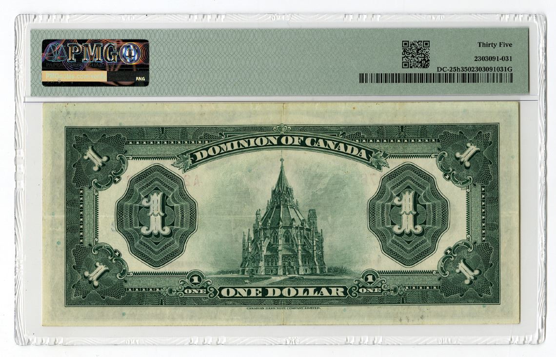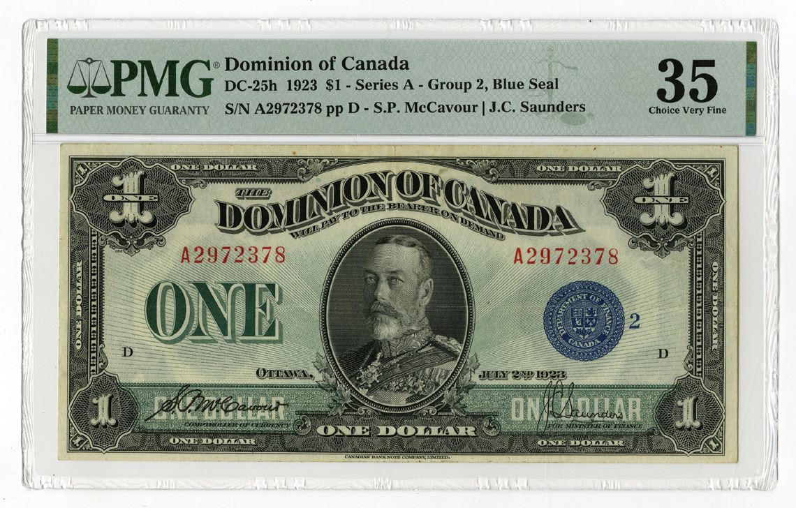 Canada, 1923. 1 Dollar, P-33h DC-25h, Issued Banknote, Black on green underprint and Portrait of King George V at center, Back is green with Library of Parliament at center, S/N A2972378 pp D, PMG graded Choice Very Fine 35, CBNC.