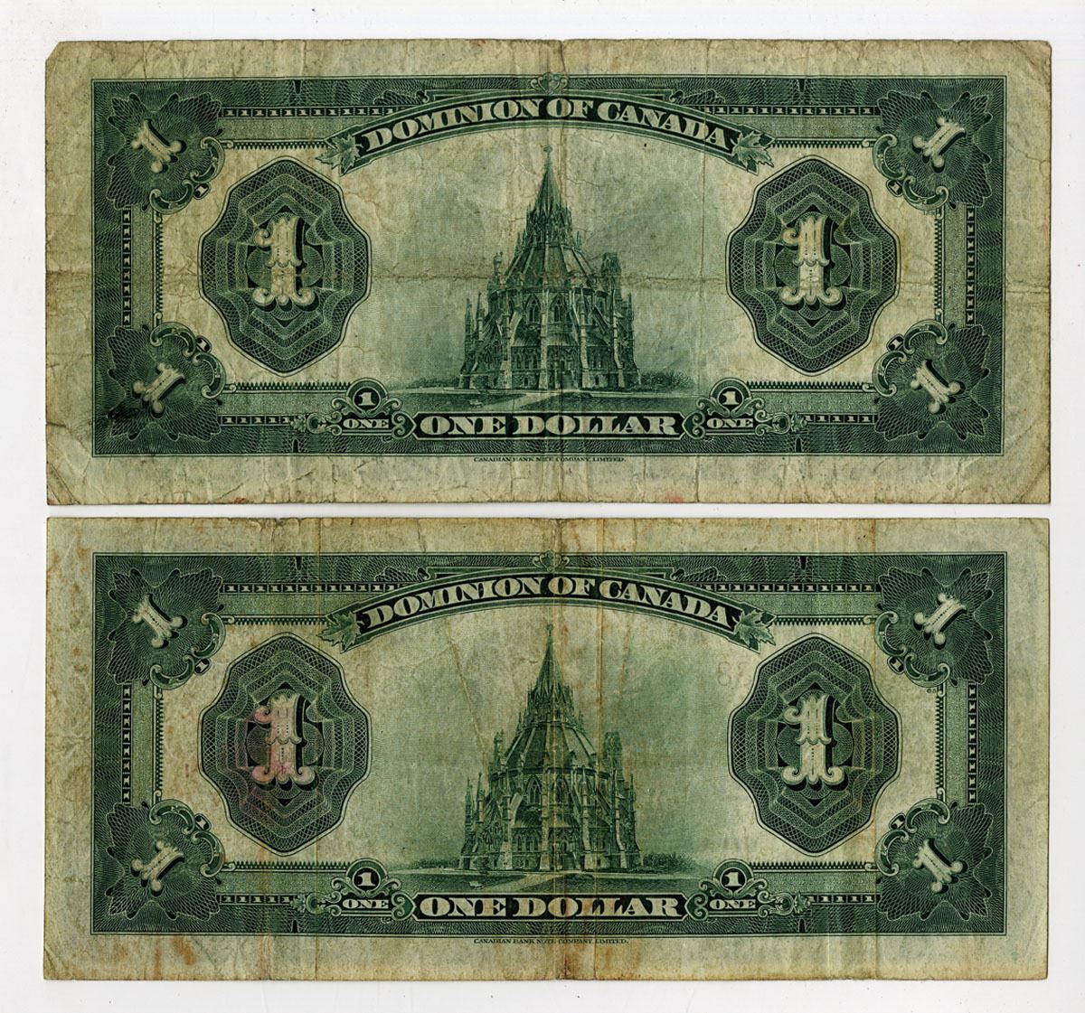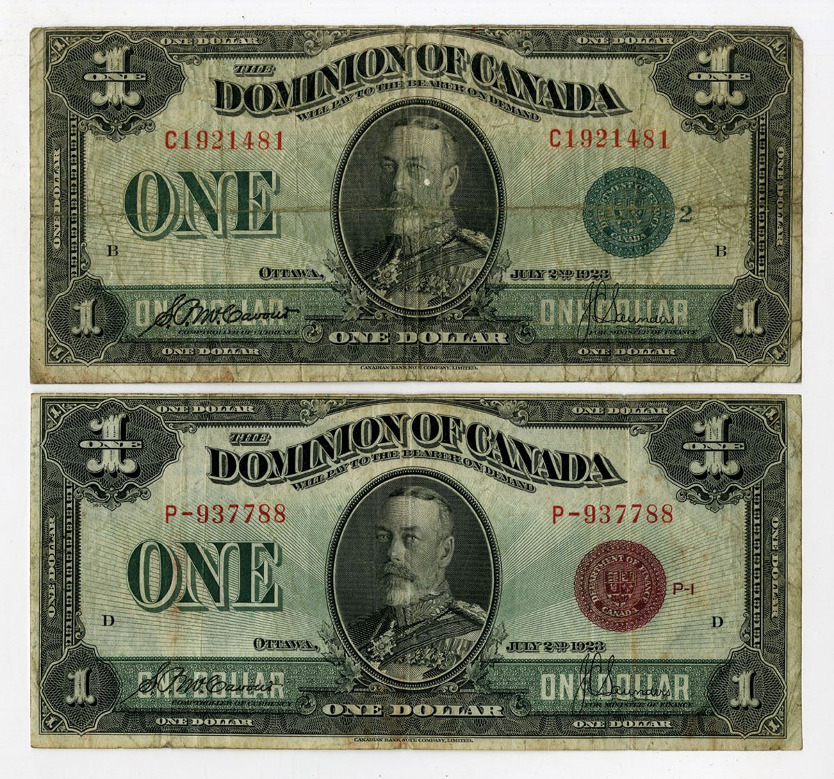 Ottawa, Canada, 1923. 1 Dollar, P-33j & P-33i, Pair of Issued Banknotes, Black on green underprint with King George V at center and bank seal at right, Back is green with Library of Parliament at center, S/Ns C1921481 & P-937788, Notes range from Fine to VF condition and printed by CBNC. (2). Sold "AS IS" no returns accepted.