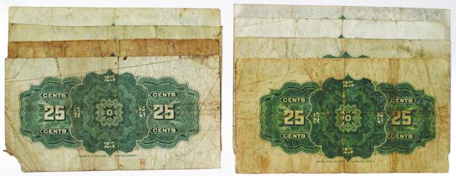 CanadaÉ Group of Issued 25 Cent, 1900, P-9a (4) and P-9b (4), black on light brown underprint, Britannia seated with shield and trident at right, sailing ship in background, ABNC. Notes range from Fine-VF condition (8)(Sold "AS IS" No returns accepted)