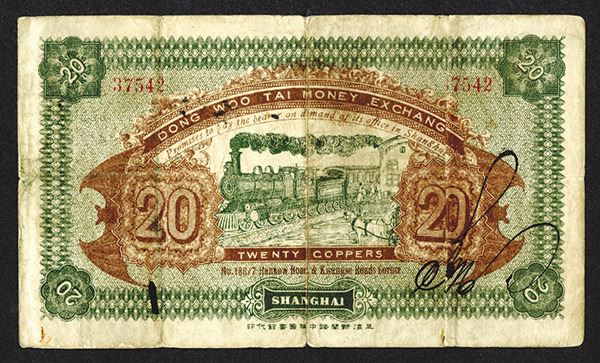 Shanghai, China. 20 Coppers, P-UNL., Issued banknote, Dark gray-green on light yellow green underprint with facing lions holding globe on front, back with train passing people and horse in gray-green and brown, S/N 37542, English signature, Location of business was at "286/7 Hankow Road & Kwangse Roads corner". Fine to Very Fine condition, Rare Shanghai local note.