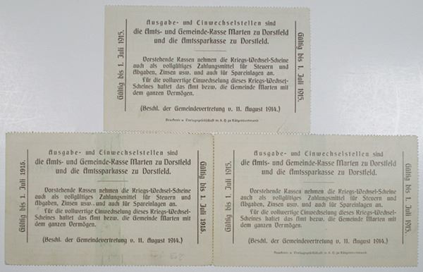 Germany. 1914. Lot includes a trio of 1/2 Mark, 2 Mark, and 3 Mark war exchange token Notgeld, all canceled with "UngŸltig" handstamp. XF to About Unc. (3)