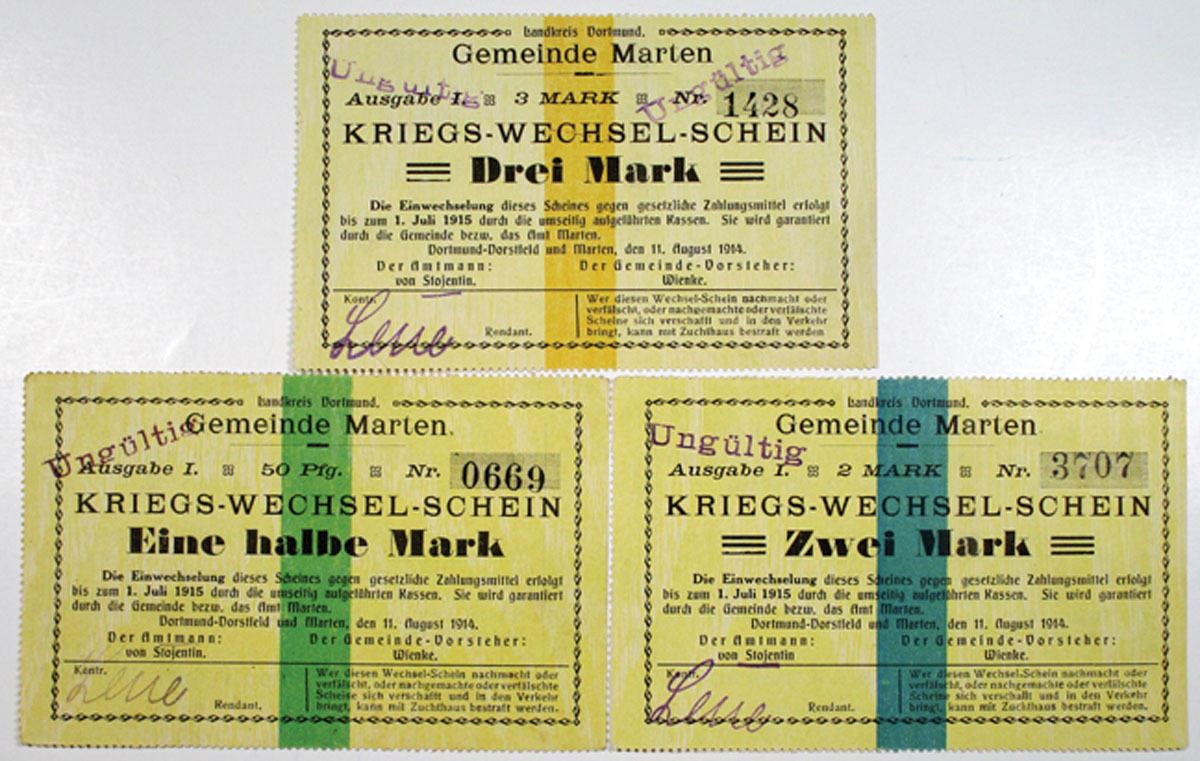 Germany. 1914, Lot of 3 emergency Notgeld notes, 1/2 Mark, 2 Mark, and 3 Mark war exchange token Notgeld, all canceled with "Ungültig" handstamp. XF to Uncirculated condition. (3)