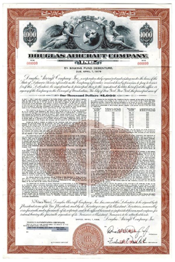 Delaware. $1000 Specimen 5% Sinking Fund Debenture Coupon Bond, Black print on brown border and under tint, Allegorical figures at top flanking image of space and airplanes, Specimen overprints and POC's, VF-XF condition, ABNC.
