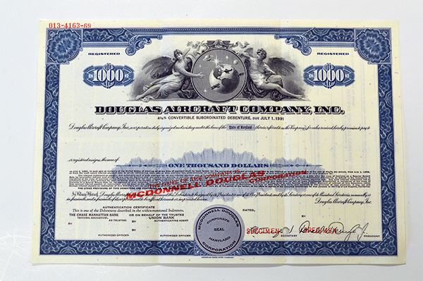 Maryland. $1000 Specimen 4 3/4% Convertible Subordinated Debenture Registered Bond. Overprinted With Name Change to "McDonnell Douglas Corporation". Black print with blue border and under print. Vignette of two allegorical figures flanking the globe with airplanes. Specimen overprints, POC's, ABNC. Extremely Fine.