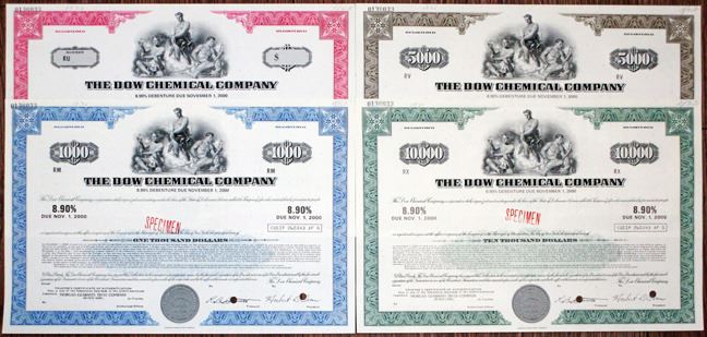 Delaware, 1970 (Due 2000). Lot of 4 pieces, all are Specimen 8.90% Registered Debenture Bonds, Includes: $1000 in blue; $5000 in brown; $10,000 in green; and $Odd in pink. All have red specimen overprints, POCs, and are in Uncirculated condition. Rare bond series. ABNC. (4)