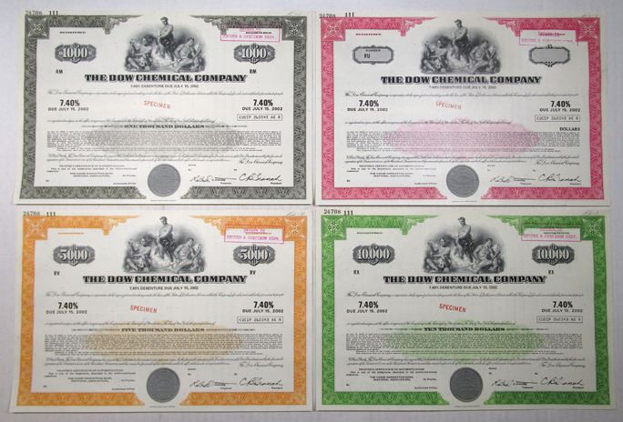 Delaware, 1972 (due 2002). Lot of 4 Dow Chemical Company, Specimen Registered 7.40% Bonds. in Varying Denominations and Colors: $-Odd in Red, $1000 in Gray, $5000 in Orange, and $10,000 in Green. All with Specimen overprint and POCs, all have "Return to Record and Specimen Dept." stamp, and are in Uncirculated condition. (4). Sold "AS IS" no returns accepted.