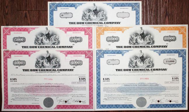 Delaware, 1975. Group of 5 bonds, all are Specimen 8.50% Registered Debenture Bonds: $25,000 in blue; $10,000 in orange; $1000 in red; $5000 in red; and $Odd in blue. All have red specimen overprints and POCs. Uncirculated condition, ABNC. The Dow Chemical Company is an American multinational chemical corporation headquartered in Midland, Michigan, United States, and a subsidiary of Dow Inc. The company is among the three largest chemical producers in the world. Dow manufactures plastics, chemicals, and agricultural products. (5)